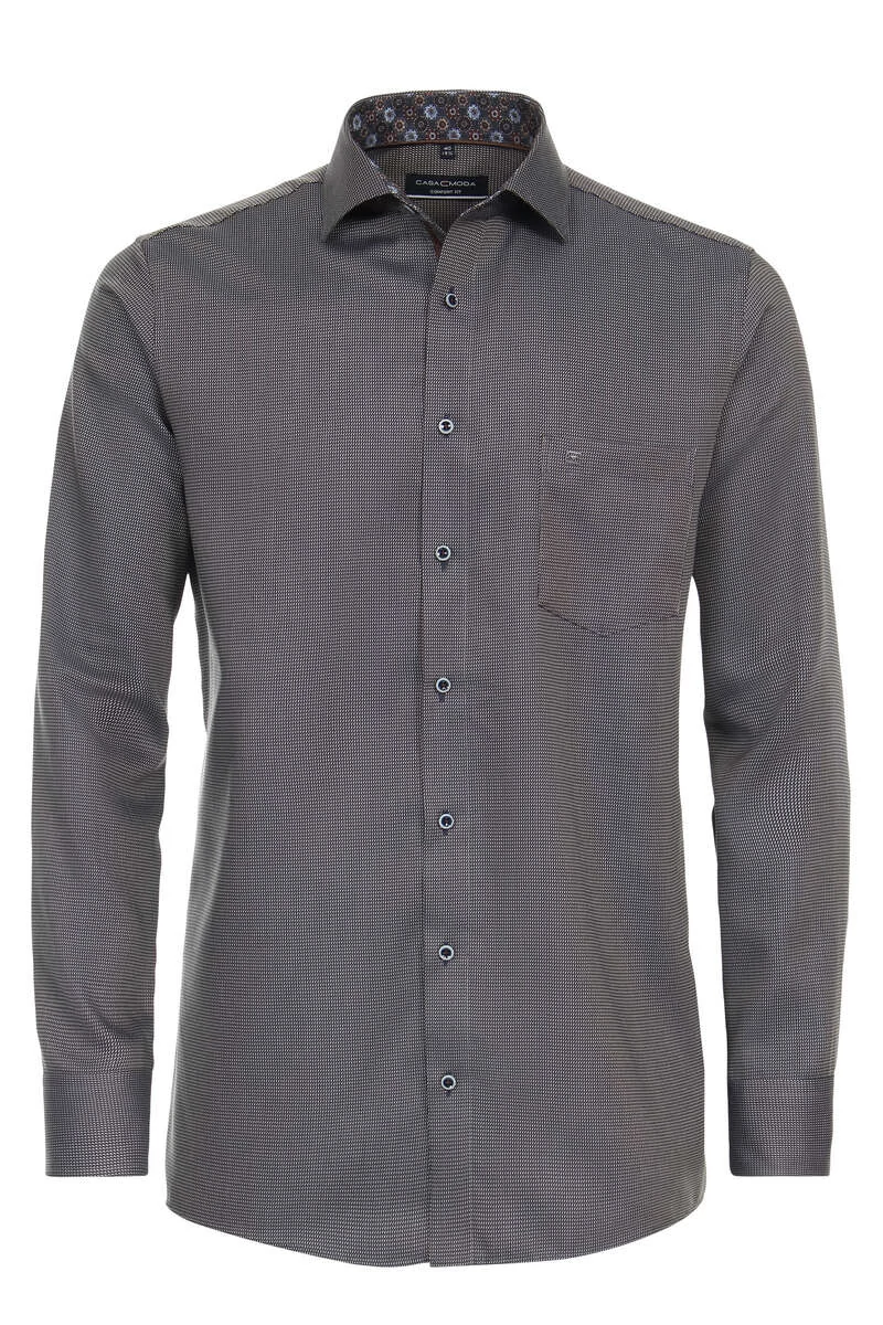 Ez a Casa Moda anyagában mintás hosszú ujjú férfi ing egy kifinomult és elegáns viselet, melyet bármilyen alkalomra viselhet. Az ing 100%-ban pamutból készült, így nagyon kényelmes és légáteresztő. Vasalást nem igényel. A modern szabásának köszönhetően mindig jól mutat, míg a minta igazán elegánssá varázsolja az öltözetet. Az ing bal elején található egy hímzett logóval ellátott zseb , ami megkönnyíti a tárolást. Tökéletesen passzol farmerrel vagy színben vele harmonizáló chinó nadrággal.