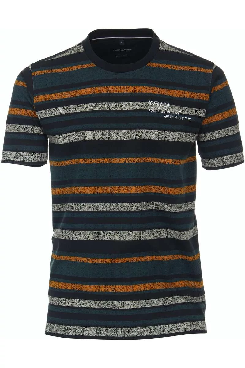 Ez a Casa Moda csíkos férfi póló tiszta pamut minőségű és magas szintű viselési kényelmet biztosít. A kerek nyak kialakítás ideálisan egészíti ki a sportos megjelenést, és sokféleképpen kombinálható. Legyen szó farmerről, chinóról vagy rövidnadrágról. Minden ruhatár számára elengedhetetlen.