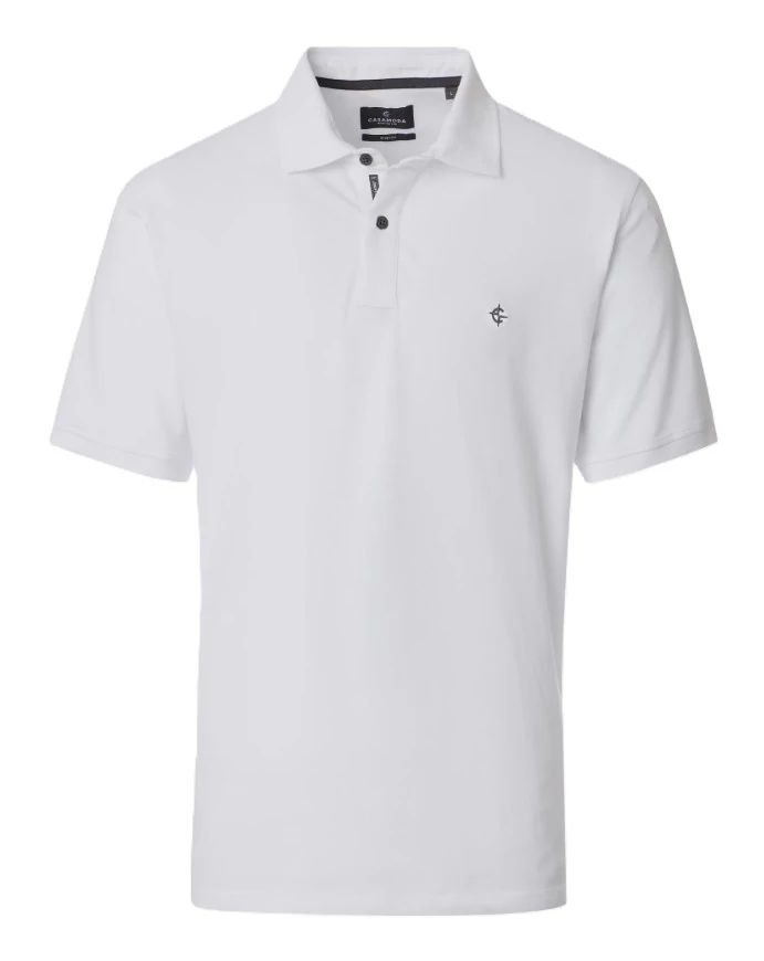 Ez a Casa Moda fehér, férfi galléros póló magas pamuttartalmának köszönhetően ideális viselet. A kényelem fokozására elasztánnal kombinálták. Kontrasztos, két gombos kialakítása igazán divatossá teszi. Két oldalon felsliccelve. Jól kombinálható több stílussal. Lazábbtól az elegánsig.