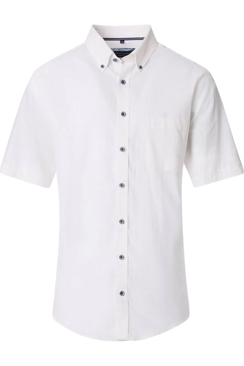 A Casa Moda fehér, rövid ujjú férfi ing egy kifinomult, modern stílusú ruhadarab, amelyet a legmagasabb minőségű anyagokból készítettek. Az ing 45% pamutból és 55% vászonból készült, így biztosítva a hosszantartó kényelmet és szellősséget. Bal elején, hímzett márkajelzéssel ellátott zseb található. Sötétkék gombolással záródik. Ez a Casa Moda fehér rövid ujjú férfi ing tökéletes viselet mindennapi használatra farmerrel vagy akár elegánsabban, chino nadrággal kombinálva.