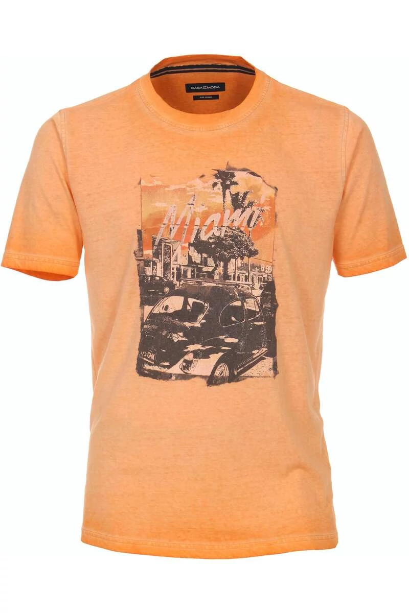 Casa Moda különleges, koptatott, narancs színű, mintás, kerek nyakú férfi póló. Jól mutat farmerrel és szabadidőnadrággal is.