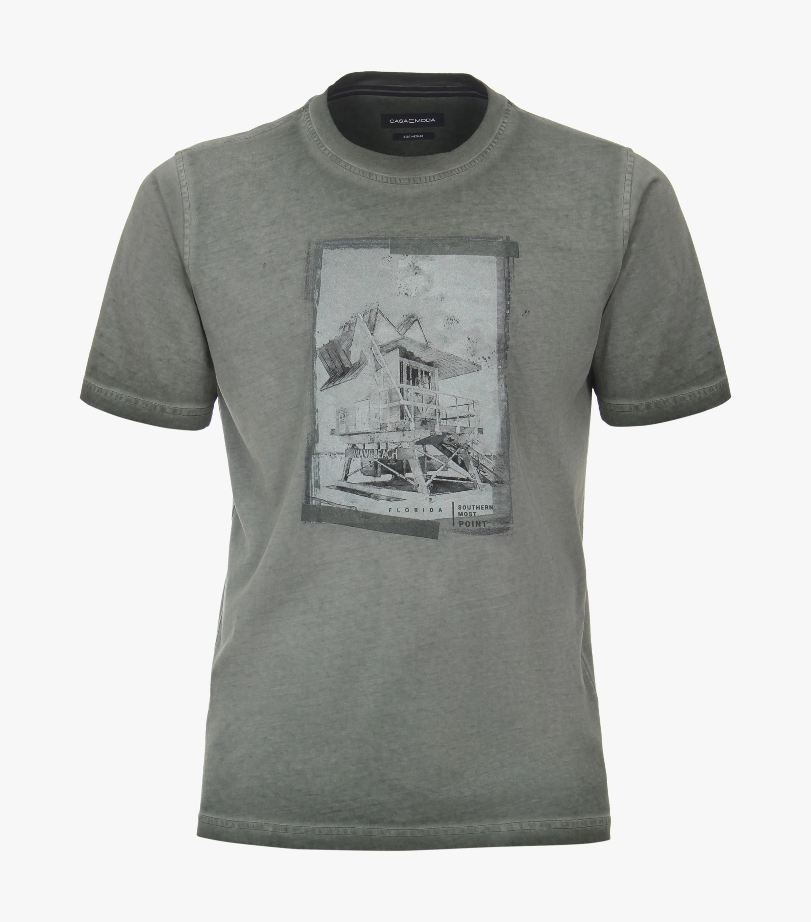 Ez a Casa Moda zöld, mintás, kerek nyakú, férfi póló egy kényelmes, modern stílusú ruhadarab, melyet a hétköznapokban is viselhet. A 100% pamutból készült modell kellemes tapintású és légáteresztő tulajdonságokkal rendelkezik, így a nyári melegben is könnyedén viselheti. Jól mutat farmerrel és rövidnadrággal is.