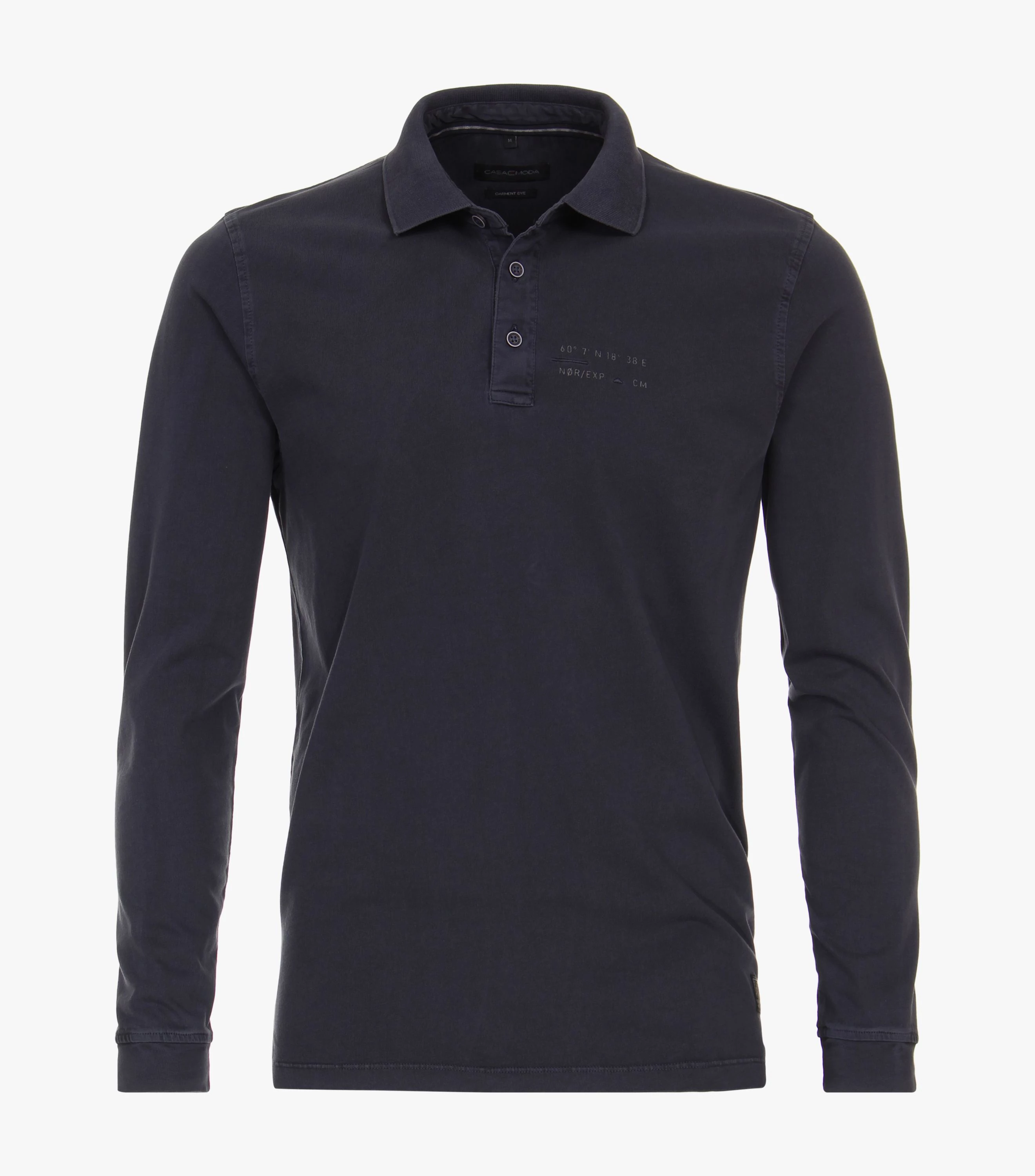 Ez a Casa Moda sötétkék, hosszú ujjú, galléros férfi póló egy igazán klasszikus darab. Elől három, sötétkék gombbal záródik. Ujja passzéban végződik. Jól mutat farmerrel a hétköznapokban. Nem hiányozhat egyetlen divatos férfi ruhatárából sem.