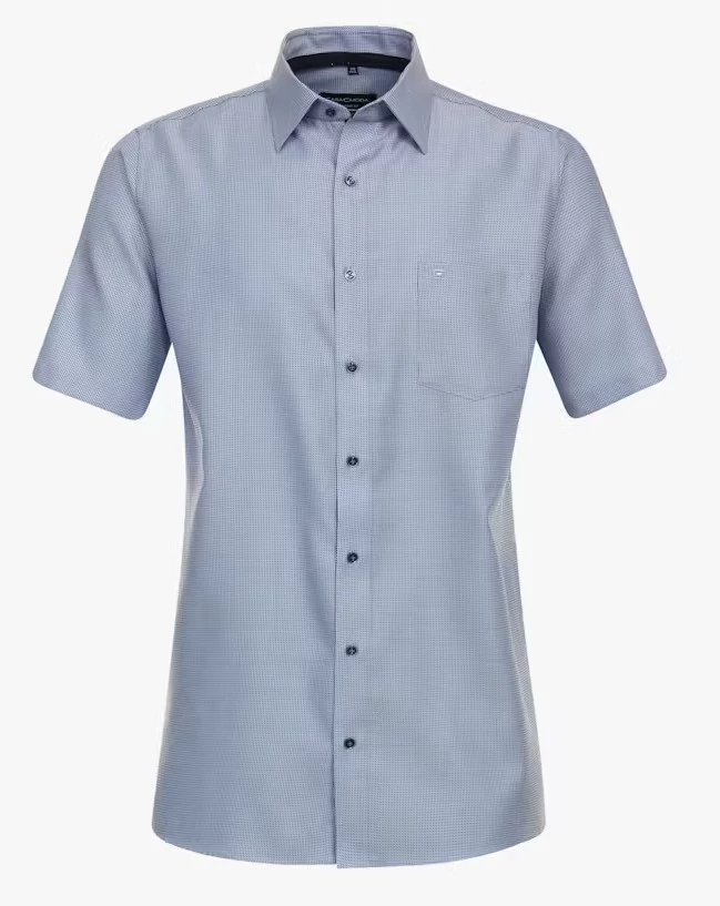 A Casa Moda kék mintés, rövid ujjú férfi ing egy kifinomult, modern stílusú ruhadarab, amelyet a legmagasabb minőségű anyagokból készítettek. Az ing 100%-ban pamutból készült, így biztosítva a hosszantartó kényelmet és szellősséget. Bal elején, hímzett márkajelzéssel ellátott zseb található. Sötétkék gombolással záródik. Ez a Casa Moda rövid ujjú férfi ing tökéletes viselet mindennapi használatra farmerrel vagy akár elegánsabban, chino nadrággal kombinálva.