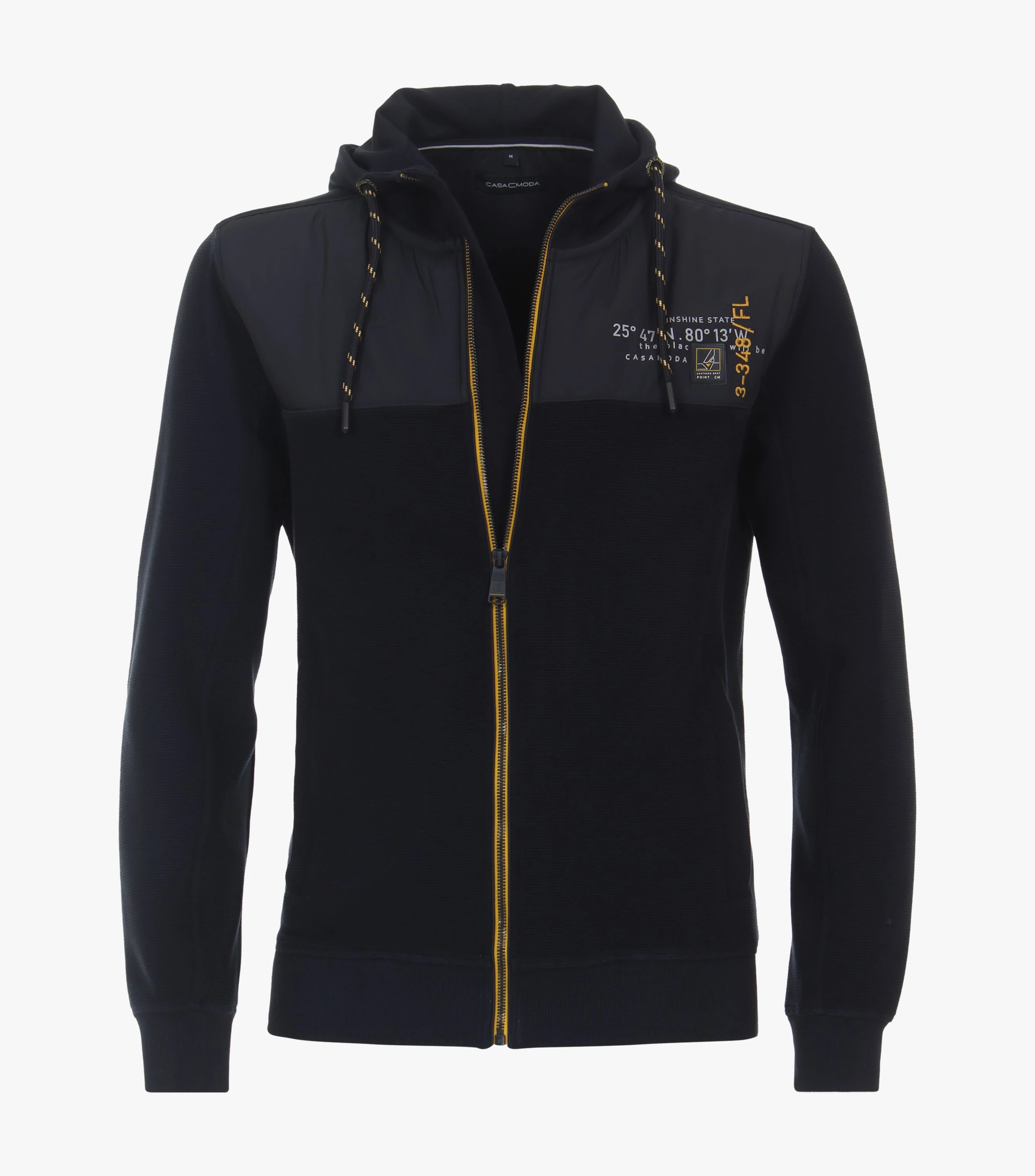 Ez a Casa Moda sötétkék, végig cipzáras, kapucnis férfi pulóver megfelelő viselet akár a mindennapokban is. A mellkason lévő steppelt betét és a kontrasztos cipzár teszi igazán különlegessé. 2 oldalsó zsebében elférnek a legszükségesebb dolgok. Magas pamuttartalmának köszönhetően kényelmes viseletet biztosít, ezért sem hiányozhat egyetlen ruhatárból sem