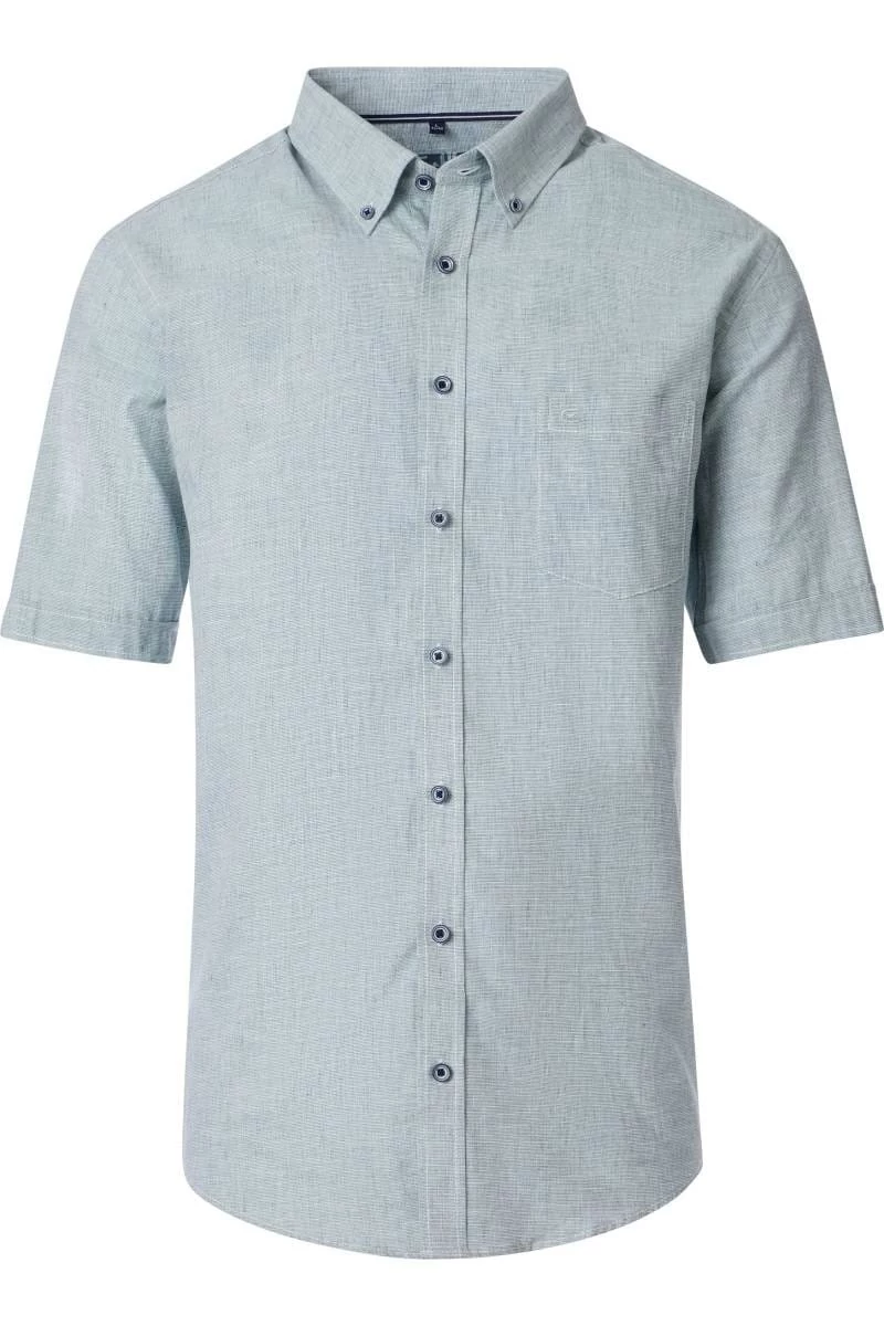 A Casa Moda zöld, rövid ujjú férfi ing egy kifinomult, modern stílusú ruhadarab, amelyet a legmagasabb minőségű anyagokból készítettek. Az ing 45% pamutból és 55% vászonból készült, így biztosítva a hosszantartó kényelmet és szellősséget. Bal elején, hímzett márkajelzéssel ellátott zseb található. Sötétkék gombolással záródik. Ez a Casa Moda zöld rövid ujjú férfi ing tökéletes viselet mindennapi használatra farmerrel vagy akár elegánsabban, chino nadrággal kombinálva.