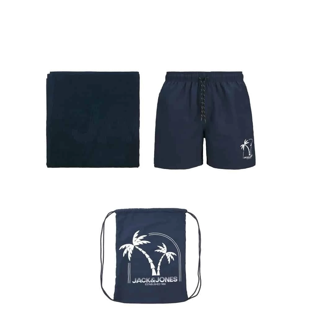 Ez a férfi, sötétkék Beach szett a nyári napokra készült, a jól ismert és megbízható márkától, a Jack & Jones-tól. Ez egy olyan szett, amely kombóként tartalmaz fürdősortot, törölközőt és egy táskát.