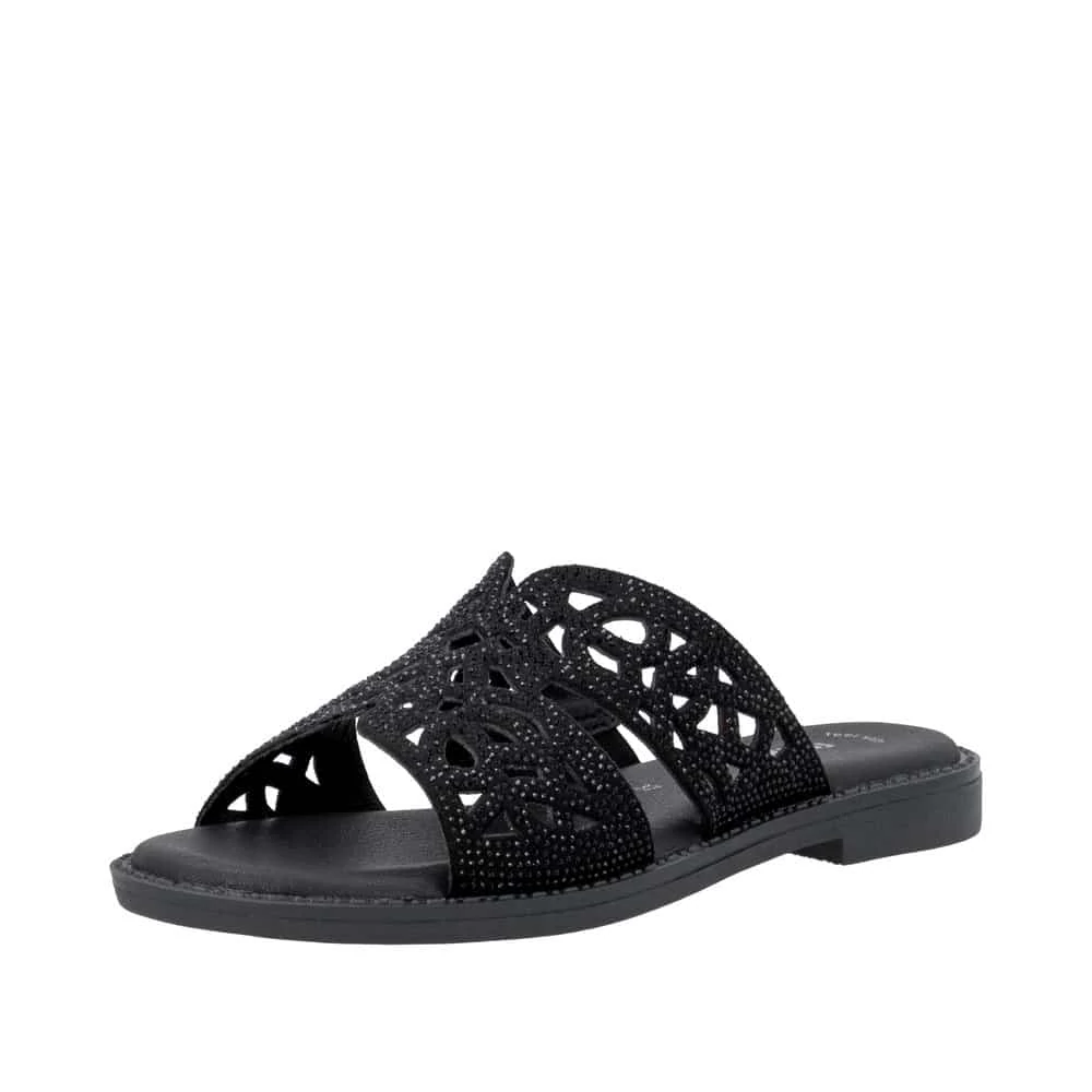 Ez a Remonte fekete papucs egy igazán elegáns és stílusos megjelenést adó modell. A papucs pántjának belső oldalán kapott egy gumis betétet, a még tökéletesebb illeszkedésért. Ez az igazán trendi és modern fekete papucs tökéletes viselet lesz mindennapi viseletre vagy akár alkalmi eseményekre is!